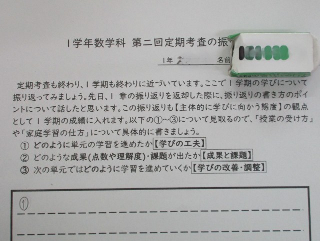 第2回 定期考査の答案が返却されました。テストの結果を受けて「振り返り」を行いました。①どのように単元の学習を進めたか【学びの工夫】②どのような成果・課題が出たか【成果と課題】③次の単元では、どのように学習を進めていくか【学びの改善・調整】について、「授業の受け方」や「家庭学習の仕方」の視点に立って記入しました。次回のテストに活かしていきましょう。