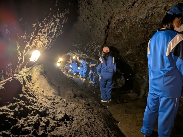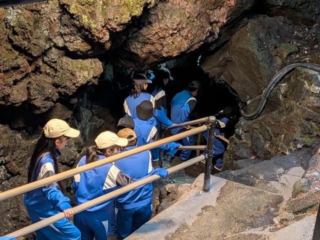 鳴沢氷穴に到着しました。外気温14℃、氷穴の中は3℃位でしょうか?寒かったです。氷穴内の移動は通路が狭く天井も低いため、頭をぶつけないように気をつけて進みました。愉しく氷穴を学びました。