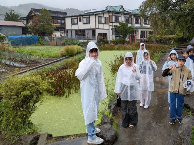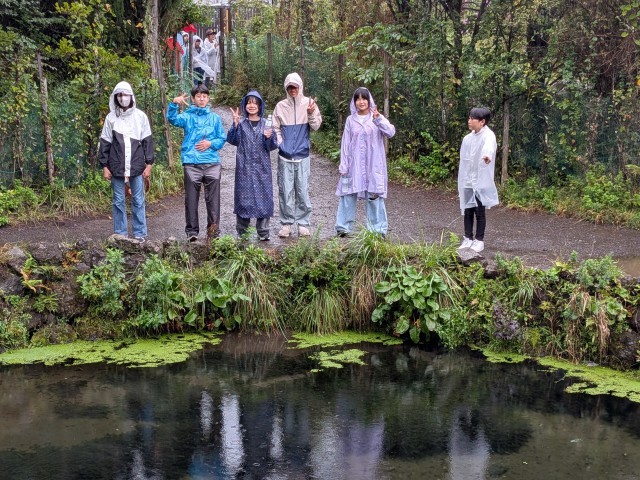 忍野八海スタンプラリーを雨天決行。御釜池、銚子池、湧池、濁池、鏡池、菖蒲池にいる先生にスタンプを押してもらいます。だいたいの班が、すべての池を廻りました。