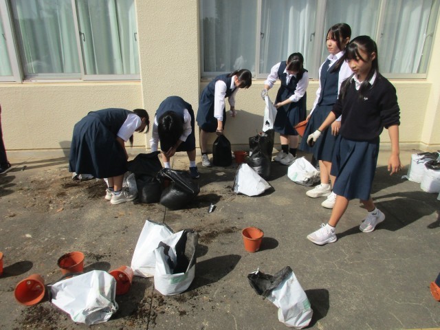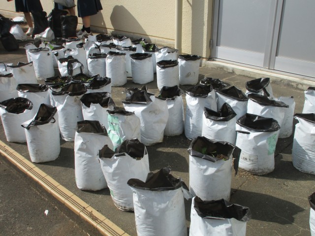 2年 技術「生物育成」の単元では、「大根」を育てます。本時は「土づくり」です。袋状の鉢に、土と肥料を混ぜていきます。次回は種まきです。