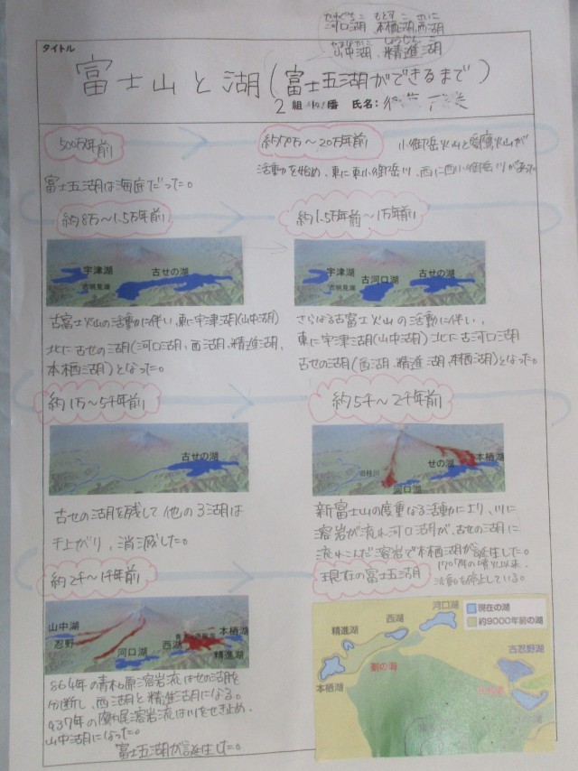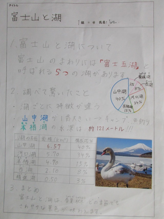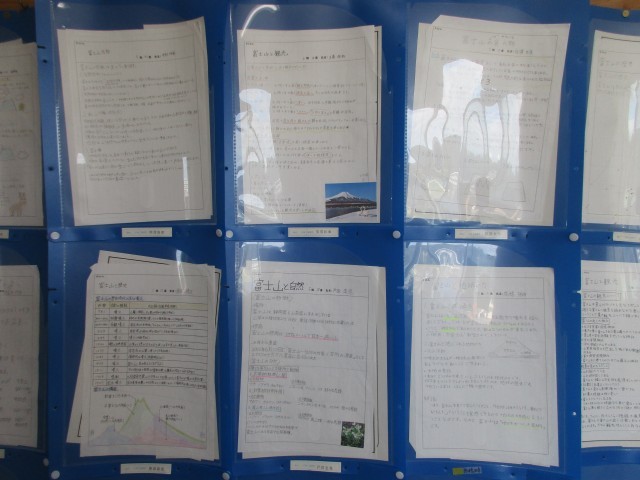 2年生は、今週の木曜日から1泊2日の富士山自然体験教室に出かけます。2年生のフロアーの掲示板には、富士山自然体験教室に向けた事前学習が掲示されています。富士五湖や富士山周辺に生息する生き物、火山活動、ほうとう、富士山周辺の名物など、さまざまなテーマで調べ学習を行いました。
