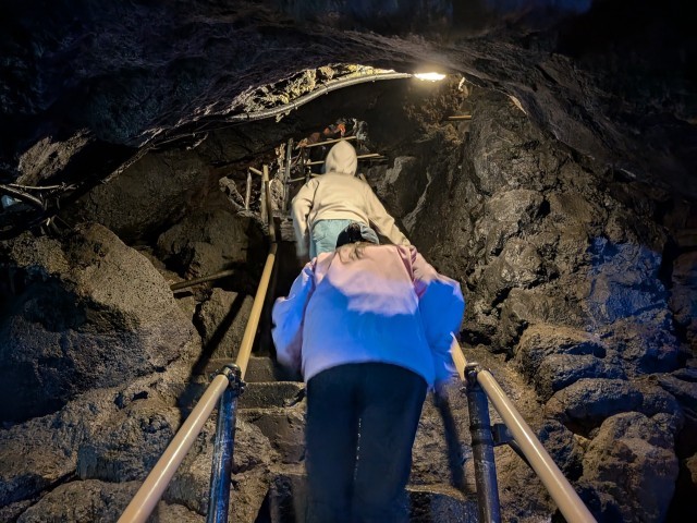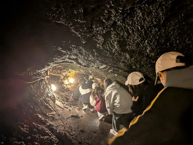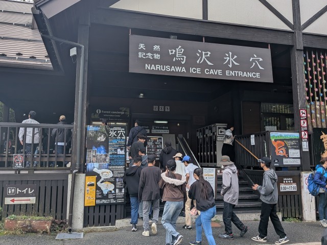 鳴沢氷穴を見学しました。外気温14℃、氷穴の中は3℃位でしょうか。ひんやり寒かったです。頭をぶつけないようにしゃがんで進みます。生徒は氷穴内の氷に興奮していました。