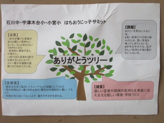小中連携教育の一環で、石川中・小宮小・宇津木台小の3校で、「ありがとうツリー」を作成しています。優しい言葉や感謝の気持ちを素直に伝え合える優しい学校づくりを目指しての取り組みです。3校の児童会・生徒会本部が中心になって進めています。本校の「ありがとうツリー」は、小学校からのリーフも届いているので、どんどん大きくなっています。心温まる素晴らしい活動です。