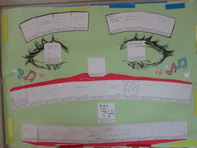 3年生の教室前の廊下には、クラスで作成した合唱コンクールに向けた掲示物が貼られています。3年生の中には、明日の合唱コンクールが人生最後の合唱コンクールになる人も多いことでしょう。悔いが残らないように、全力で歌い、自らも感動してください。3年生、明日の合唱コンクール、期待しています。