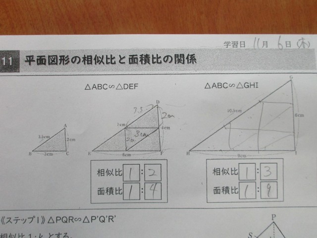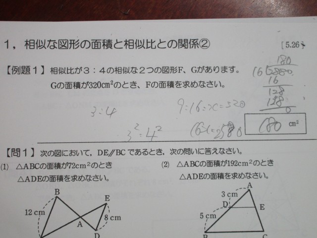 面積比は相似比の2乗の比になることを利用して、相似な図形の面積を求めました。来週の定期考査に向けて、最後の追い込みです。生徒は必死に問題に取り組んでいます。