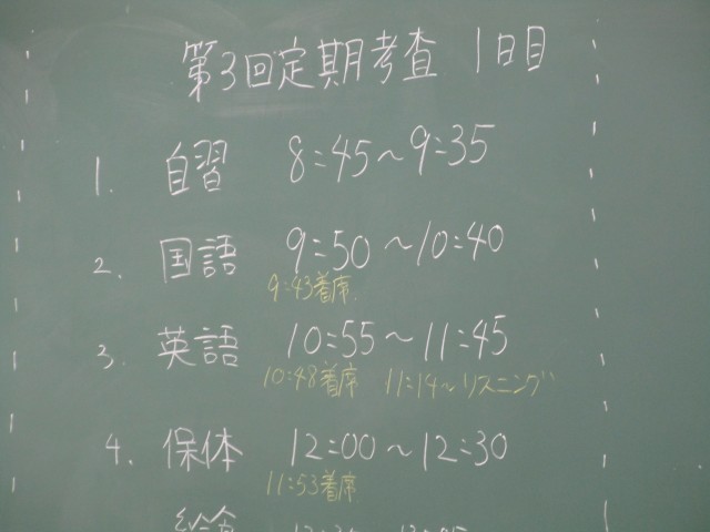 1年生の明日のテストは、社会(50分間)、理科(50分間)、音楽(30分間)、3年生の明日のテストは、社会(50分間)、理科(50分間)、美術(30分間)で実施します。体調管理の徹底をお願いします。
