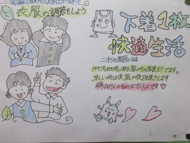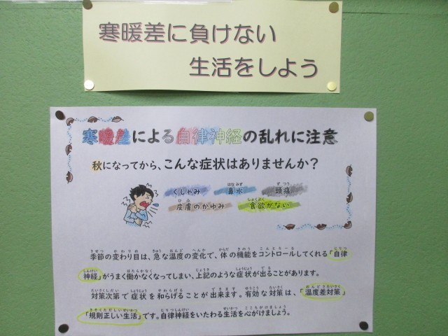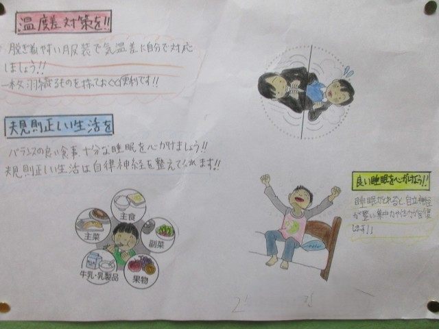 「寒暖差に負けない生活をしよう」というテーマで、保健委員会がポスターを作ってくれました。保健室前の掲示板に貼ってあります。