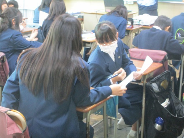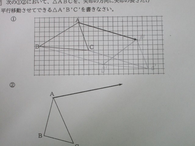 本時の目標は「図形の平行移動ができるようになる」です。まずは、方眼紙上に描いてある三角形を平行移動させました。次に、方眼紙上にない三角形の平行移動を行いました。2つの三角定規を用いて平行線を描き、コンパスを使って長さを写しました。ペアで確認しながら学習を進めています。