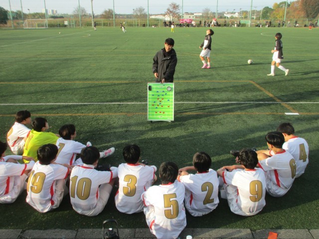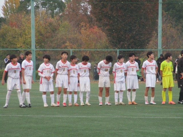 第69回 東京都中学校サッカー新人大会 3回戦が、昨日と同じ、調布市西町サッカー場で行われました。対戦相手は、優勝候補筆頭とされる6支部の修徳中学校です。前半は守りを固め、無失点、0-0で終了しました。後半も相手のロングボールに防戦一方でしたが、終了5分前に相手陣地ペナルティーエリア付近で得たフリーキックを見事ゴールし、1-0で勝利しました。10回戦って1回勝てるかどうかの相手に対しジャイアントキリングです。今大会で私立中学校2校を破りました。来週の11月29日(土)は準々決勝です。会場は日野陸上競技場、対戦相手は1支部の青陵中学校、kick off は12:00です。みなさん、応援よろしくお願いします。