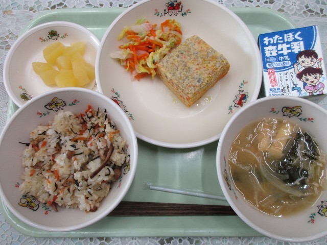今日の給食の献立は、・ひじきご飯・厚焼き卵・白菜のゆず風味・たまねぎのみそ汁・果物(りんご缶)・牛乳です。