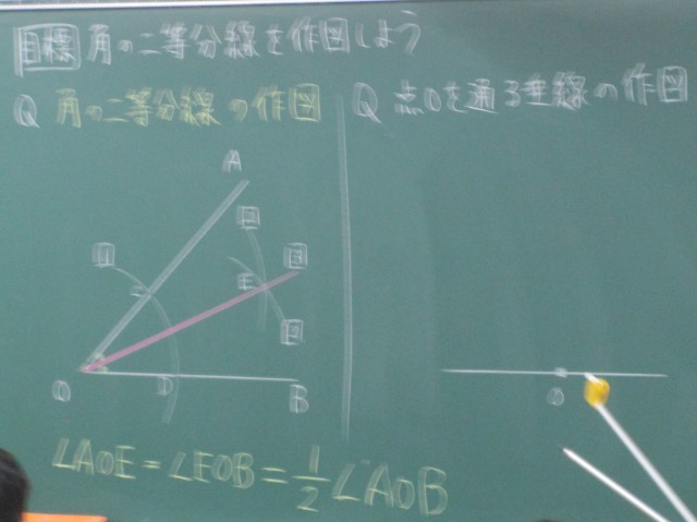 本時の目標は「角の二等分線を書くことができる」です。垂線の作図、垂直二等分線の作図の次に、角の二等分線の作図を学習しました。180°の半分が90°になることに気づき、角の二等分線を学習したことで、直線上の点からその線に垂線を引くことができるようになりました。
