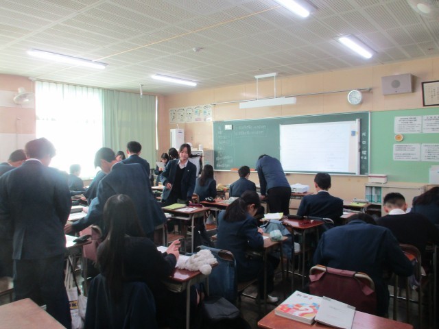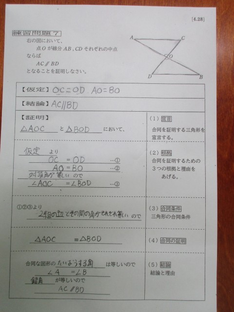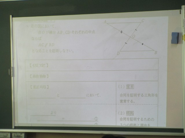 本時の目標は「図上の2直線が平行であることを証明できる」です。三角形の合同証明を行い、合同な三角形の対応する角が等しくなることを利用します。2直線が平行になるための条件は、同位角または錯角が等しいことを表す必要があります。難しい証明問題ですが、仲間と協力しながら、課題解決に努めました。