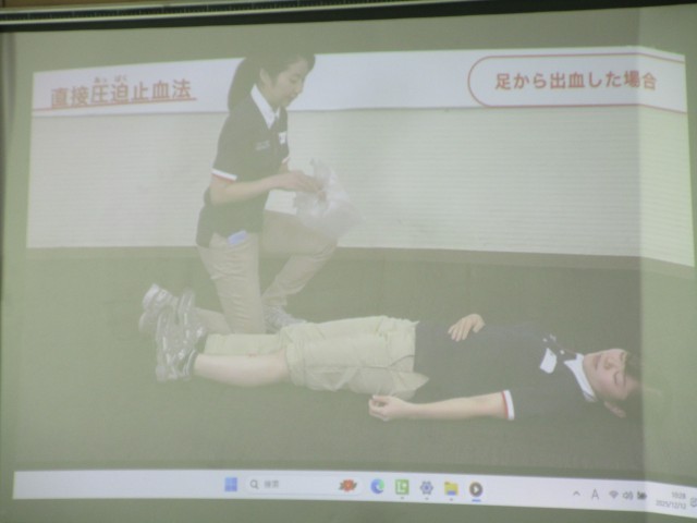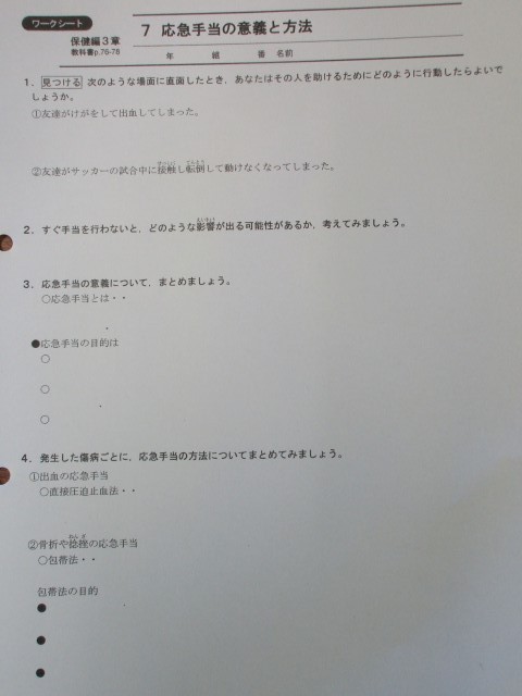 応急手当の意義や目的を学びました。具体的な状況を想像しながら、学習を進めました。出血があったときに行う直接圧迫止血法や骨折や捻挫があったときの包帯法などを動画を観ながら確認しました。怪我があったときに、今日の授業が生かされることを期待します。
