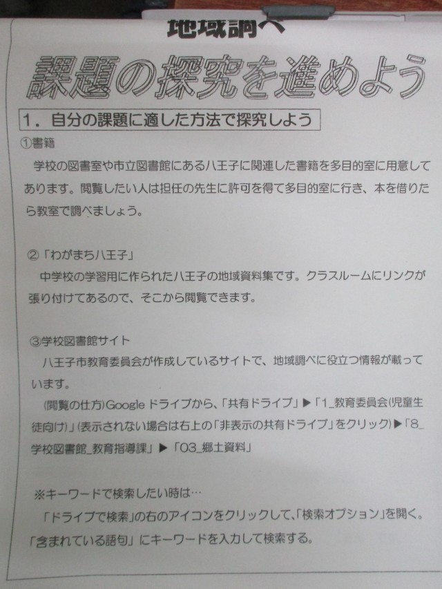 1年生の総合的な学習の時間では「地域調べ」を行っています。学習班ごとに探求課題を決めました。たとえば、「高尾山はなぜ人気なのだろうか」や「八王子はなぜ桑都と呼ばれているのか」、「千と千尋の神隠しはなぜ八王子が舞台になったのだろうか」などです。仮説を立てて、書籍や「わがまち八王子」、学校図書館サイトなどを利用して調べます。学習班ごとに発表用スライドを作成します。
