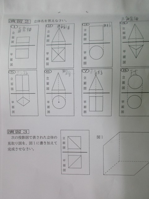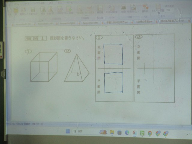 立体を、真上から見た「平面図」と、真正面から見た「立面図」で表しました。また、投影図からどのような立体かを考えました。仲間と協力して、課題に取り組んでいました。