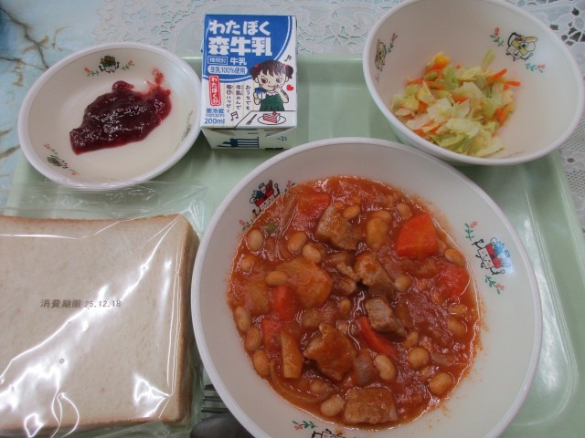 今日の給食の献立は、・国産小麦パン・手作り苺ジャム・ポークビーンズ・コールスロー・牛乳です。