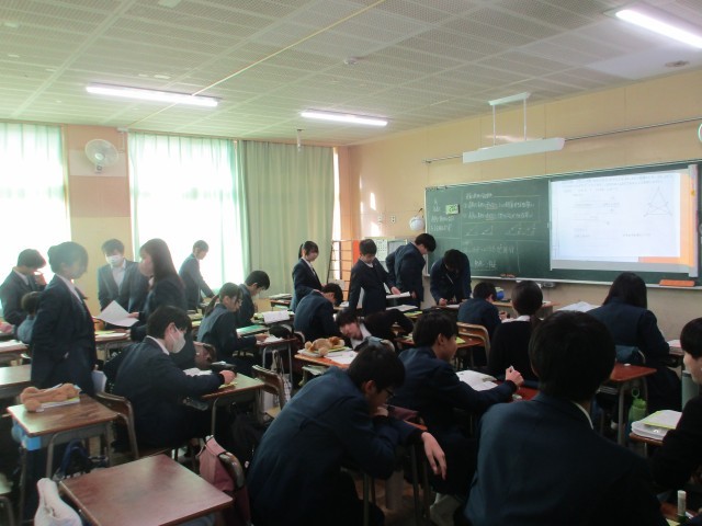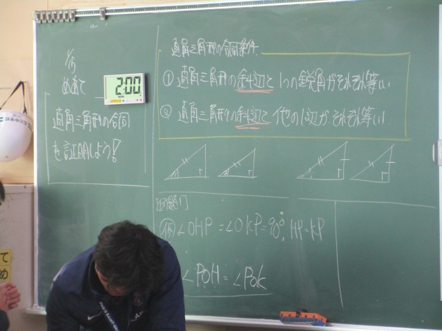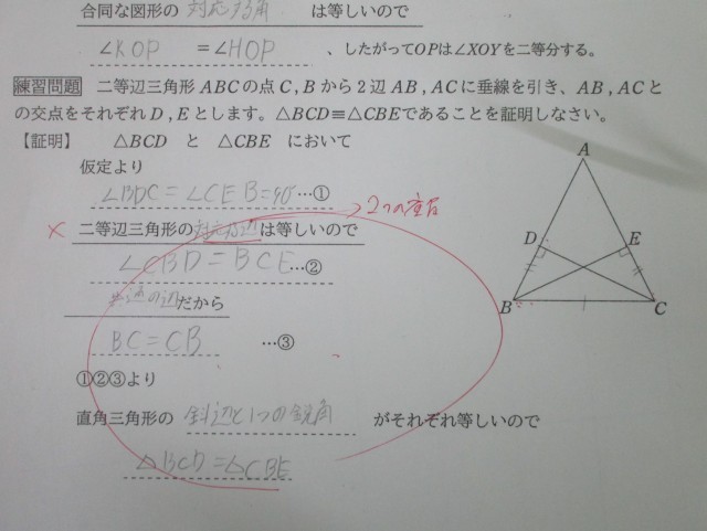 直角三角形の合同条件「直角三角形の斜辺と一つの鋭角がそれぞれ等しい」「直角三角形の斜辺と他の1辺がそれぞれ等しい」を利用して、証明問題に取り組みました。一人一人、担当の先生に〇をつけてもらいました。