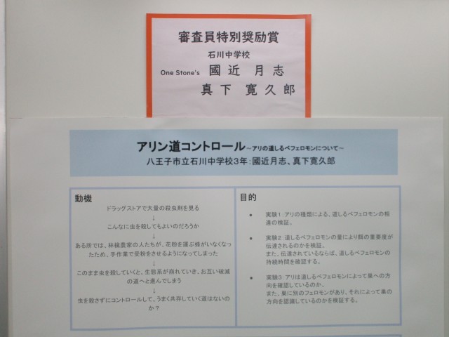 おおるり展に、第17回 八王子市中学校 科学コンクール で、審査員特別奨励賞を受賞した、石川中学校3年の「One Stone`s」の2人の作品が展示されました。