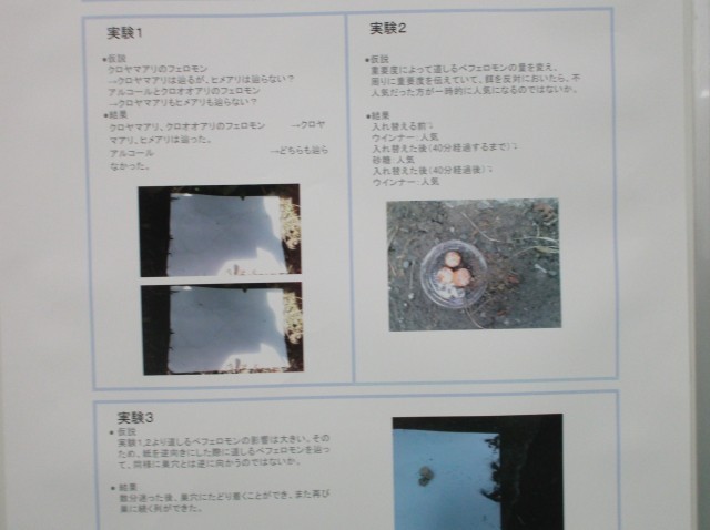 作品名は「アリン道コントロール ~アリの道しるべフェロモンについて~」です。校内での発表は2学期の全校集会で行いました。素晴らしい発表でした。