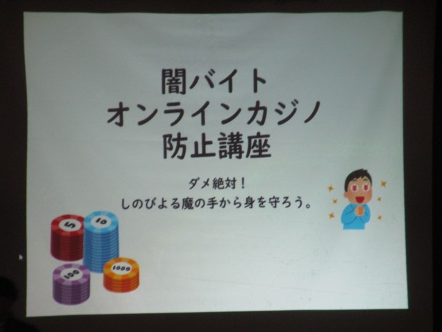 闇バイト オンラインカジノ 防止講座を全校生徒対象に体育館で行いました。闇バイトとはどのようなものかを「闇バイトクイズ」で学びました。また、闇バイトの事例を動画を観ながら確認し、闇バイトにかからわないようにするための対策を学びました。合わせて、オンラインカジノについても確認し、日本では、オンラインカジノをすることは犯罪であることを学びました。オンラインカジノでは、お金は決して増えません。必ず、負けます。みなさん、オンラインカジノと闇バイトの負のスパイラルに陥らないように注意しましょう。