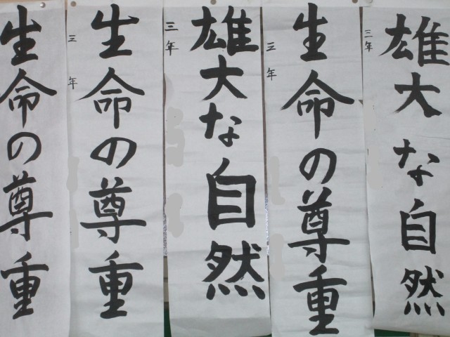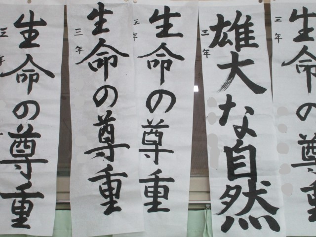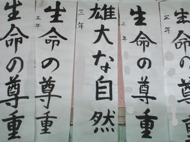 3年生の書き初めが教室に掲示されています。今年の3年生の書き初めは、「生命の尊重」or「雄大な自然」です。