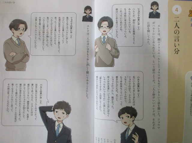 教科書の「二人の言い分」を読み、登場人物の二人の気持ちになって考えました。登場人物二人は、それぞれどうすればよかったのかまで、話し合いが発展していました。