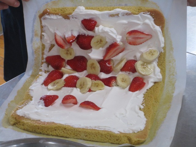 3年生の家庭科では、2時間使い、調理実習を行いました。作った料理は「ピザ」と「ロールケーキ」です。ピザは、生地にのせる具材も班で決めて作りました。豪華なピザになりました。ロールケーキは、生クリームたっぷり、苺やバナナも入れました。形は崩れてしまいましたが、味はばっちりでした。中学校生活最後の調理実習はとても豪華なものになりました。