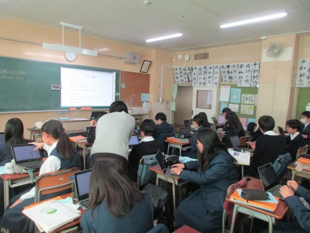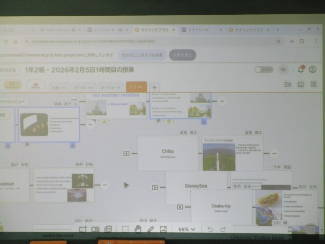 本時の目標は「1年間の思い出を共有し、感想を伝えることができる」です。1年間で一番印象に残ったことを絵日記にし、オクリンクplusで共有しました。それぞれの絵日記に英語でコメントし、一年間の思い出を共有しました。絵日記の内容は、家族旅行や部活動、おいしかった食べ物などが多かったです。chromebookを授業に有効活用しています。