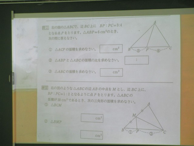 本時の目標は「三角形の面積比について理解する」です。2つの三角形の高さが等しい場合には、底辺の長さの比が面積比になります。また、底辺の長さが等しい場合には、高さの比が面積比になります。このことを利用して、いろいろな三角形の面積を求めました。仲間と協力しながら課題解決に努めました。