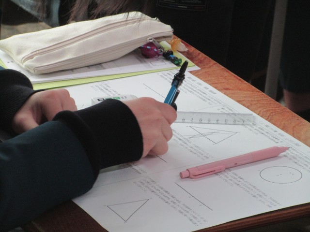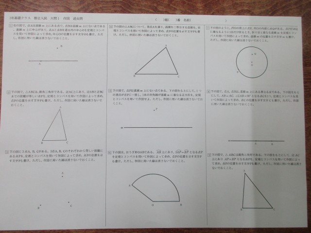 都立一般入試の 1⃣ [問9] は、毎年、作図問題が出題されます。配点は6点です。今日の3年生の数学の授業では、都立一般入試の作図問題に取り組みました。作図は難しいと感じている人が多いですが、実は使う作図は「垂直二等分線」と「角の二等分線」、「垂線(2通り)」の計4つしかありません。問題文を読んでどの作図をするのか判断するところがPOINTになります。都立一般入試が近づいてきました。生徒は真剣に学習に取り組んでいます。
