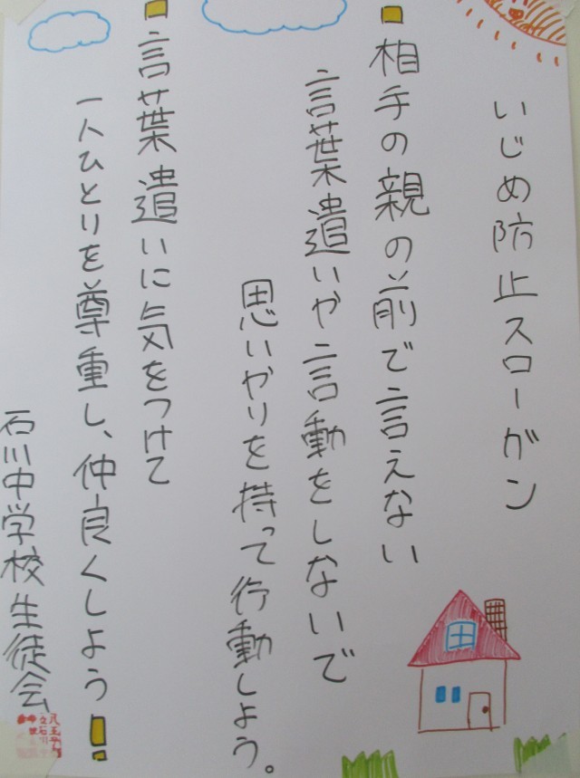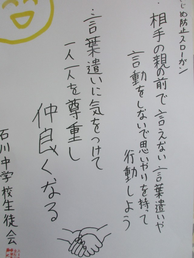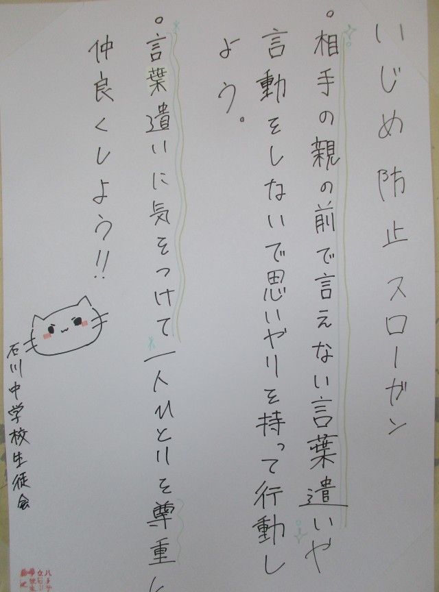 石川中の廊下のいたるところに全校生徒で考えた「いじめ防止スローガン」が掲示されています。生徒会本部役員の手作りです。