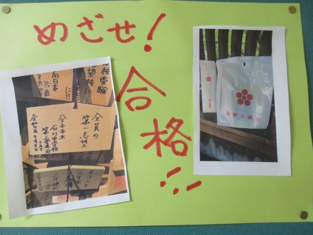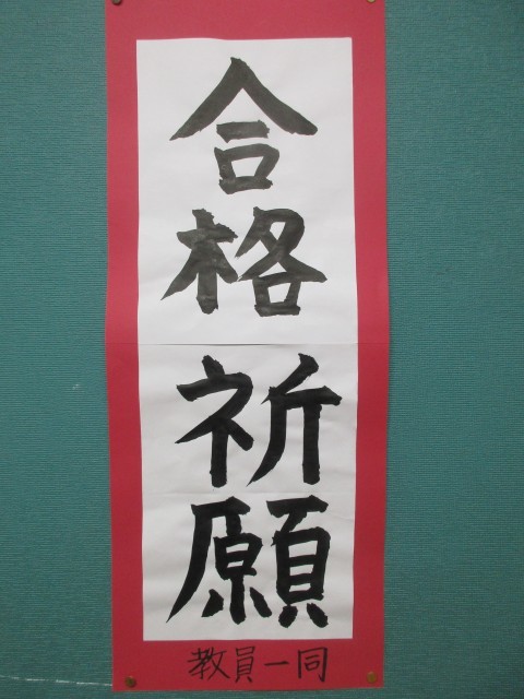 今日は、私立一般入試の集中日になります。職員室前には、3年生の合格を祈願して、だるまやお守り、絵馬などが掲示されています。3年生、自身の進路実現に向けて、全力で頑張ってください。教職員一同、全力で応援します。