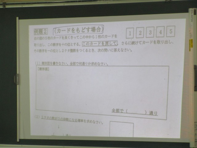本時の目標は「樹形図を利用して確率を求めることができる」です。2枚のコインを振る問題や、1~5が書かれた5枚のカードを2枚引いて2桁の整数をつくる問題などに取り組みました。2枚のカードを引く問題では、1枚目のカードを2枚目のカードを引く前に、戻すか戻さないかで確率が変わることを、樹形図を書くことで理解しました。石川中には確率が得意な生徒がたくさんいます。