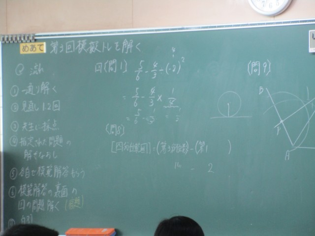 3年生の数学の授業では、今週末の都立一般入試に向けて、都立一般入試と同じ形式の模擬トレを行っています。丁寧に解説しています。間違えた問題は、今日中に家でも確認しましょう。