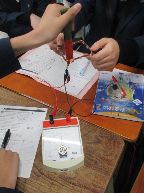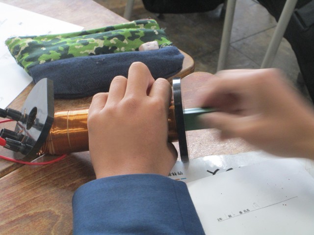 本時の目標は「誘導電流の向き・強さを確かめることができる」です。班ごとに実験して確かめました。誘導電流は、コイル周辺の磁界が変化した際に、電磁誘導によってコイルに発生する電流のことです。磁石を近づけたり遠ざけたりする際、磁界の変化を妨げる向きに電流が流れます。磁石のスピードアップやコイルの巻き数増、強力な磁石で流れる電流が増えることが、実験から分かりました。