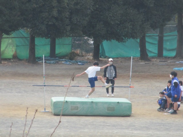 1年生の保健体育の授業では、走高跳を行っています。模範になる生徒の、助走や跳ぶときのフォーム、着地の仕方などを確認しながら実施します。レベル別にバーの高さを調整し、スモールステップで跳んでいきます。