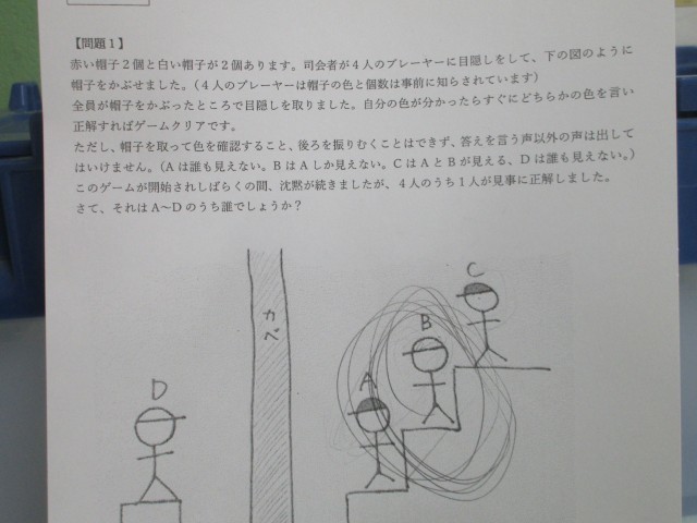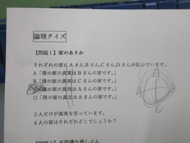 3年生の数学では、中学校で教わる内容も終了し、入試も終了したため、「数学パズル」の問題に取り組みました。教員が用意した、たくさんの論理クイズを仲間と協力しながら、解決していきました。面白い問題がたくさんあり、おおいに盛り上がりました。頭もたくさん使い、クタクタになりました。