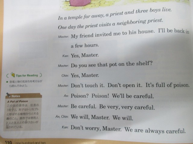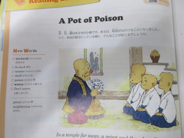 本時の目標は「A pot of Poison を読み、内容を理解することができる」です。「A pot of Poison」は狂言の演目「附子(ぶす)」を指す英語教材などです。日本の狂言が英語教材になっています。音読しながら内容を確認しました。面白い教材なので、主体的に和訳に励んでいます。