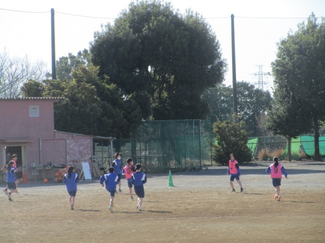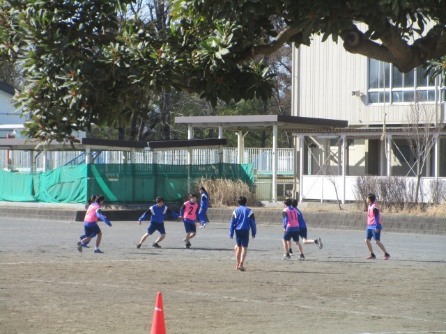 2年生の保健体育の授業では、サッカーのゲームを行っています。経験者チーム、初心者チームに分かれてチームを編成して、それぞれのレベルに合ったコートで試合をします。男女混合チームで、女子が得点したら2点入ります。男女仲良く、楽しんで体を動かしています。