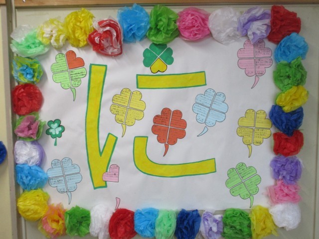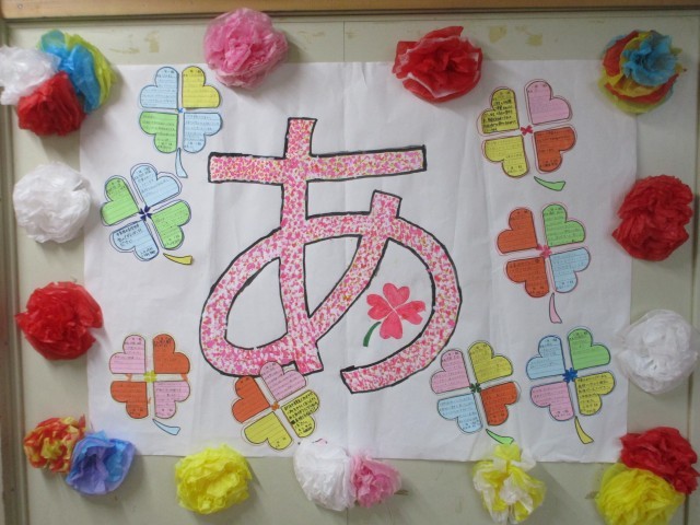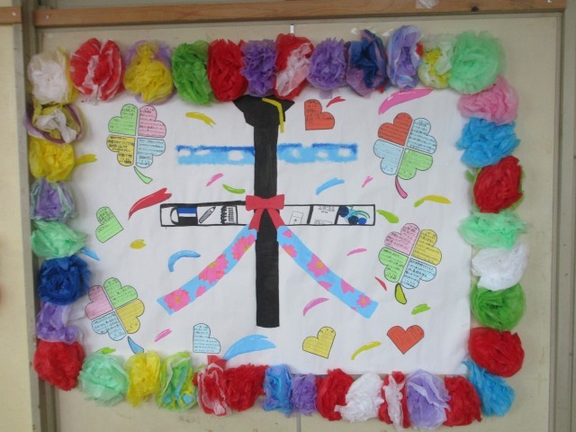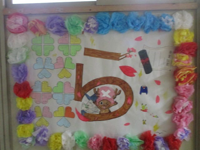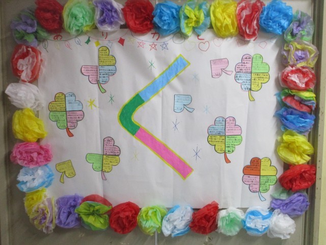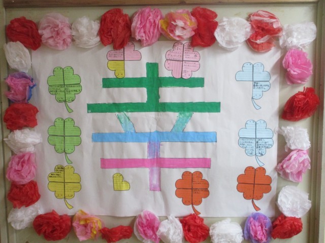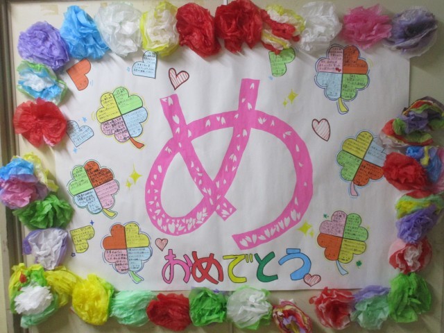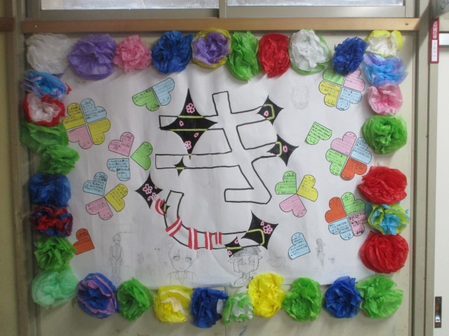 3年生のフロアーに、1,2年生から、感謝のメッセージが貼られています。「きらめく未来に幸あれ」の10文字を、1,2年生10クラスが一文字ずつ担当し、作成しました。花びらには、個別のメッセージが書かれています。3年生の卒業式が近づいてきました。一日一日を大切に過ごしてほしいです。