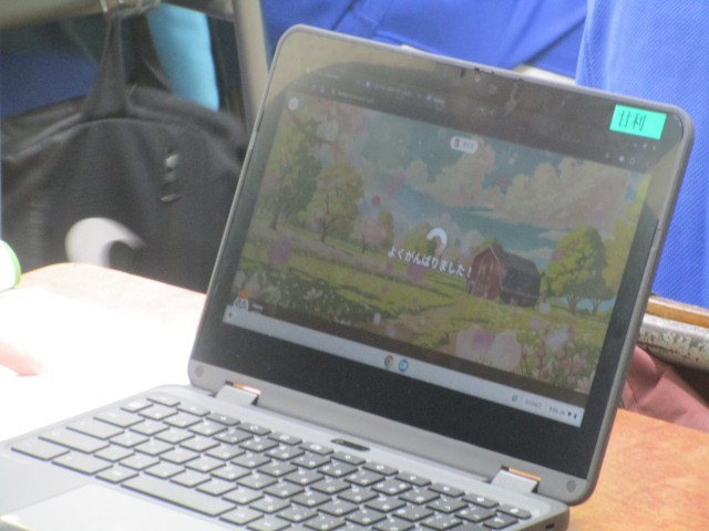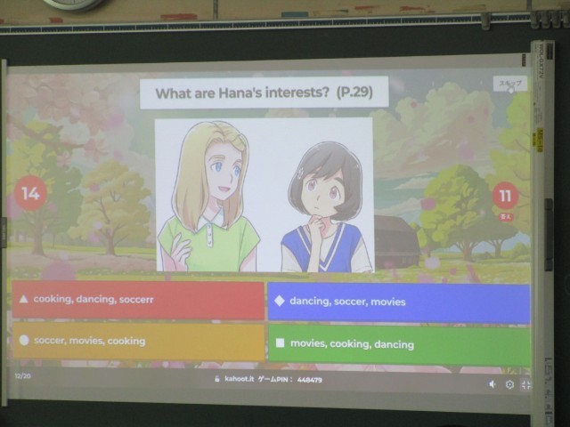 今年度最後の授業では、教科書の内容理解度クイズを行いました。chromebook を使用し、英語で出題された4択クイズに答えます。結果が集約され自身の順位も分かるので、生徒は必死に取り組んでいました。大いに盛り上がっていました。