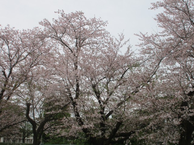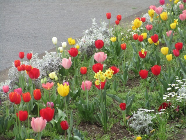 体育館横の花壇の様子です。チューリップがきれいに咲いています。テニスコートの桜は、散り始めていますが、とてもきれいです。明日の入学式が楽しみです。