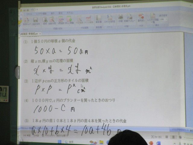 本時の目標は「単項式と多項式の違いを理解することができる」です。2年生の数学は「文字式」の学習から始まります。1年生で学習した内容を振り返りながら進めます。