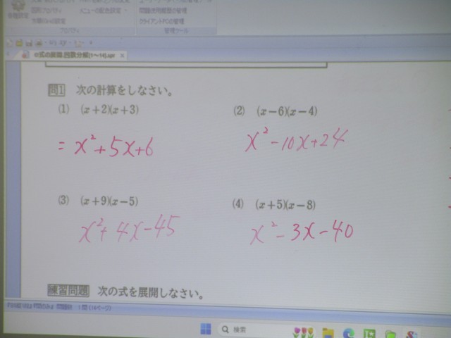 本時の目標は「乗法公式を利用して、式を展開することができる」です。文字式の計算です。3年生になり、(多項式)×(多項式)の計算ができるようになりました。今日から乗法公式の学習が始まりました。公式を使うことにより、計算の時間短縮になることを、身をもって学びました。