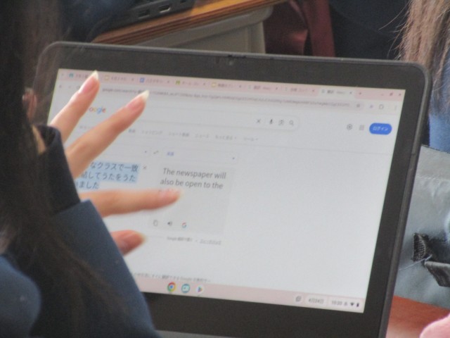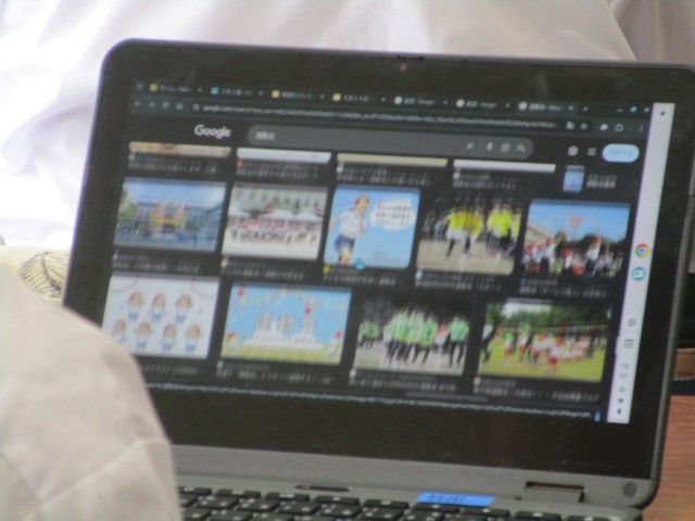 本時の目標は「英語で紹介したい学校生活の内容を分かりやすくスライドでまとめることができる」です。学校生活の内容は「sports festival」「chorus contest」「field trip」「school lunch」「cleaning time」などから選びました。4枚のスライドでまとめます。イラストや写真を入れながら分かりやすく説明できることがポイントです。完成したら、ALTの先生に発表します。