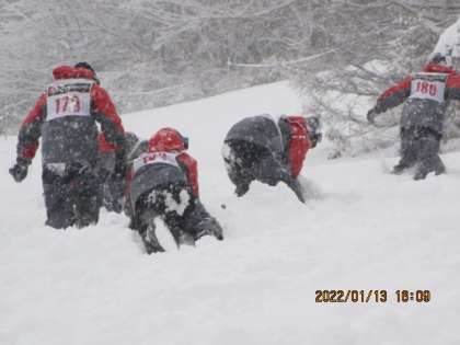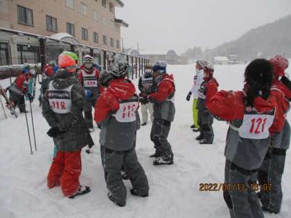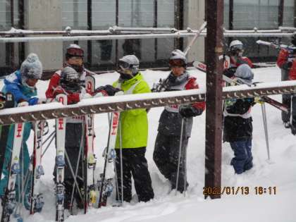 講習修了時間には、雪が本格的に降り出しました。少し早めに戻って来た班は雪遊びをしていました。板を所定の位置に置き、明日の確認とお礼の挨拶をしてミーティングを締めくくりました。
