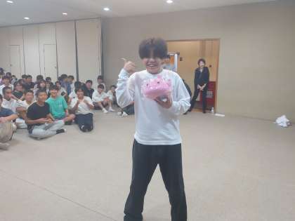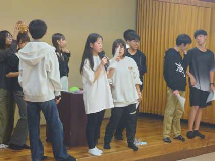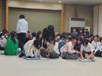 夕食後は学年レクリエーションです。先生方の思い出の曲をイントロで答えます。解答権を得るには定期考査の範囲の問題に正解する必要があります。優勝は2組。全員おおいに盛り上がりました。企画してくれた実行委員のみなさん、ありがとうございます。楽しかったです。