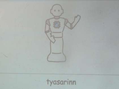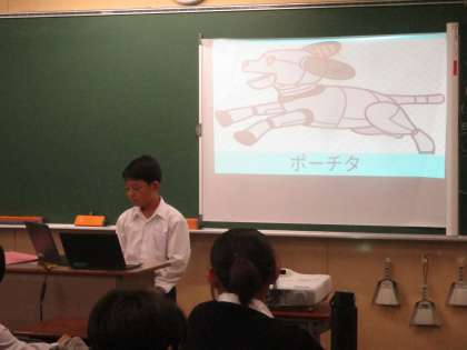 1年生の英語ではスピーチ発表を行っています。自分がクロムブック上で作ったロボットの紹介をします。英語で「このロボットは空を飛ぶことができる」や「料理が得意」等、今まで学習した文法を使いながら発表していました。