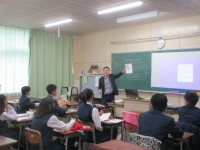 本時の目標は「be動詞+〜ingで疑問文を作ることができる」です。スクリーンに映し出されたイラストを観て、疑問文に直します。活発に手を挙げて、答えています。1年生、がんばっています。