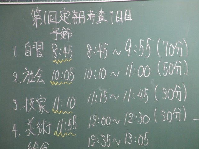 第一回 定期考査の1日目です。実施教科は、社会(50分間)、技術・家庭(30分間)、美術(30分間)です。